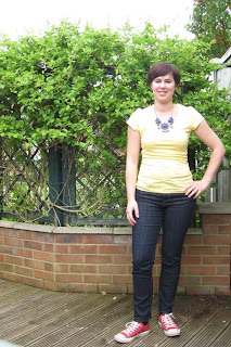 | Levi Jeans, Matalan Yellow T-Shirt, Red Converse Sneakers, Blue Necklace NewLook. |