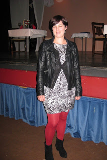 | Thrifted Dress, Gap Black Cardigan, Primark Red Tights, Tesco Suede Booties. |