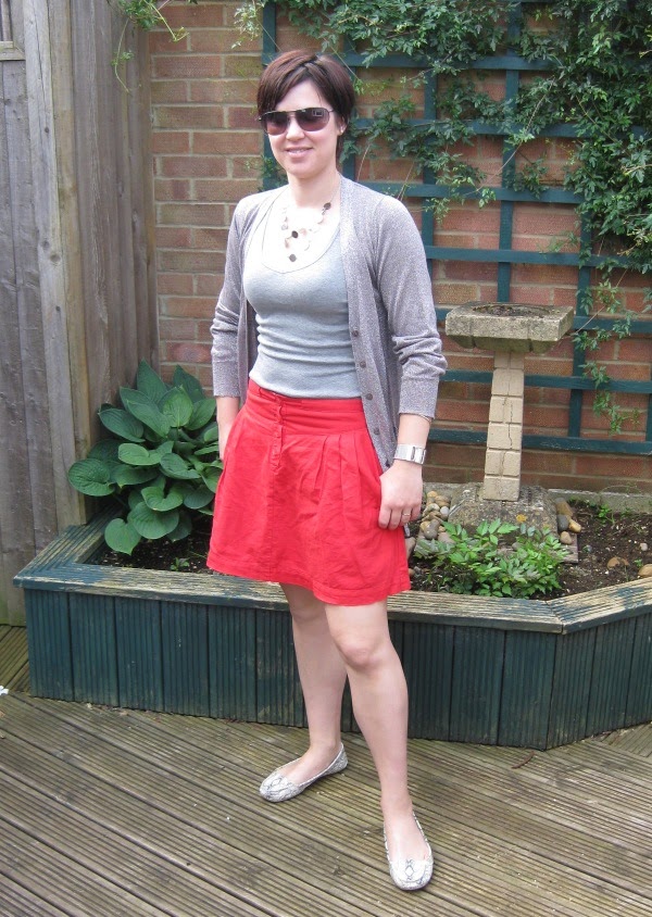 Next red skirt and sunglasses, Dorothy Perkins singlet, Primark silver cardigan and snakeskin print flats. |