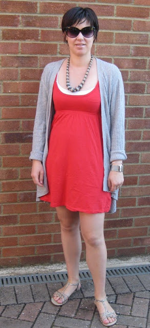Wearing H&M tangerine sundress (thrifted), Glassons grey cardigan, Next snakeskin print sandals, Portmans singlet and thrifted beads - and trying out cat's eye sunglasses from Tesco's! Linking up with Visible Monday and Thrifters Anonymous today.