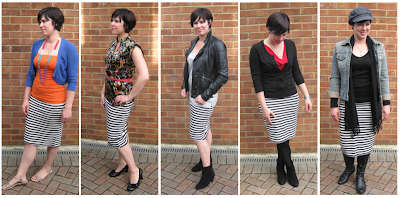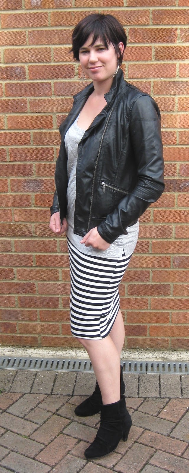 I bought this striped pencil skirt from Primark for five pounds and I love it. The stretchy jersey knit is really comfortable (as you might know, I place very high importance on this), and I find the shape and stripes flattering. I do struggle with the length (trying not to make myself look shorter than I am) but discovered in this week's Take 5 challenge that I can comfortably wear it higher on my waist when I'm not in heels.