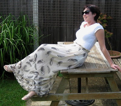 I found this one (and yes it is now my third maxi skirt) in a charity shop last week and fell in love with the feather pattern and high paper bag (drawn in) waist. I love the waist and the sheer fabric and feel totally on trend for my day out in London with hubby yesterday. I even had a compliment on this skirt from a five or six year old girl on the tube :). Special mention to Joni James @ WalkingColours who's given me the idea (after tripping many times from the hem being too constricting) to alter it with a split up the back!