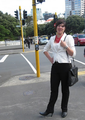 And after saying I never wear these boots - these are the 'too long for other shoes' pants so here they are again. Check out the Beehive - NZ's House of Parliment in the background.