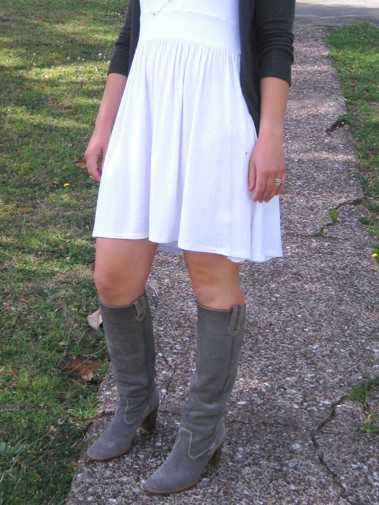 What I wore: Glassons white jersey sundress, Zara charcoal cardigan, Fake Stella and Dot necklace (thrifted), Barbara Bui grey suede pull on boots.
