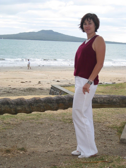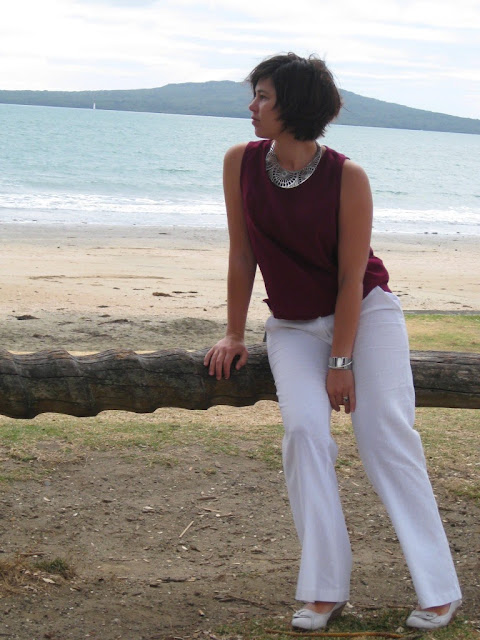 Following on my from ramblings last week about trends and adopting them when you're in the opposite season, I thought today I'd experiment with a burgandy top (otherwise known to fashionistas as oxblood, maroon, berry or wine) - but with a summer twist. Some of the top colours for the US fall/winter season have been maroon and greens and it's been interesting to see them in some of our stores in summer pieces.
