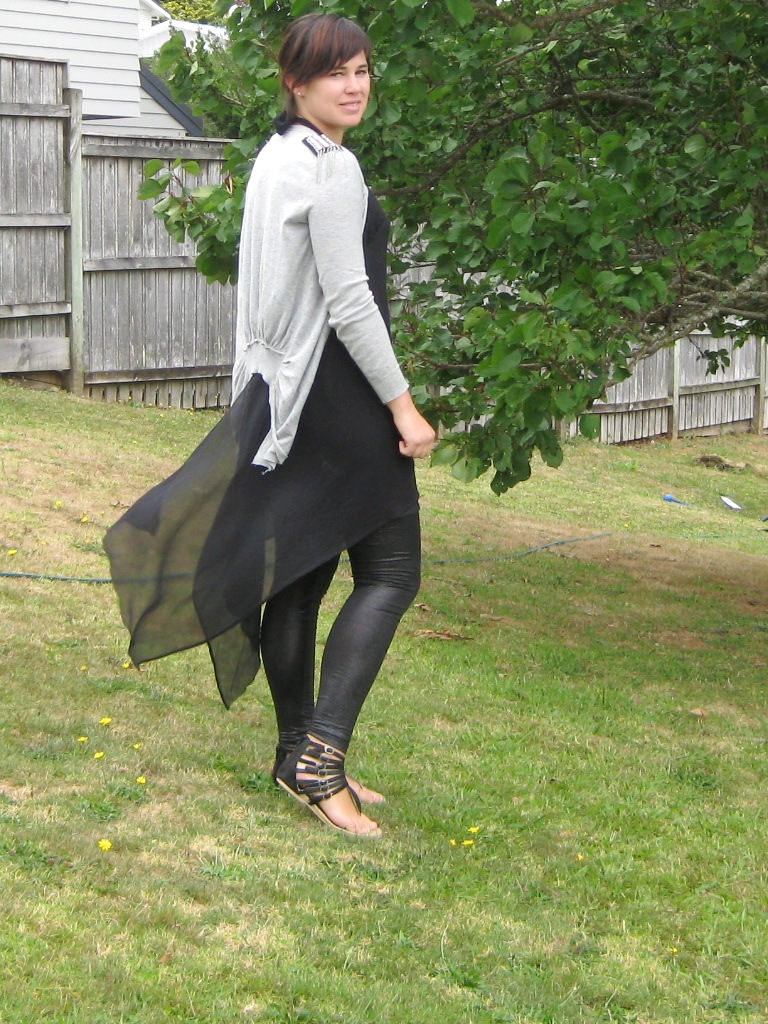 Unfortunately my self taken pics don't do this outfit justice but I really really liked it. I picked up this label-less chiffon top/dress for $1 at my local Sunday markets. Over a slip and my leggings I felt very pretty. The various black textures I thought just worked.