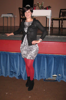 | Thrifted Dress, Gap Black Cardigan, Primark Red Tights, Tesco Suede Booties. |