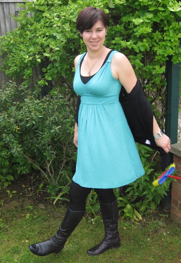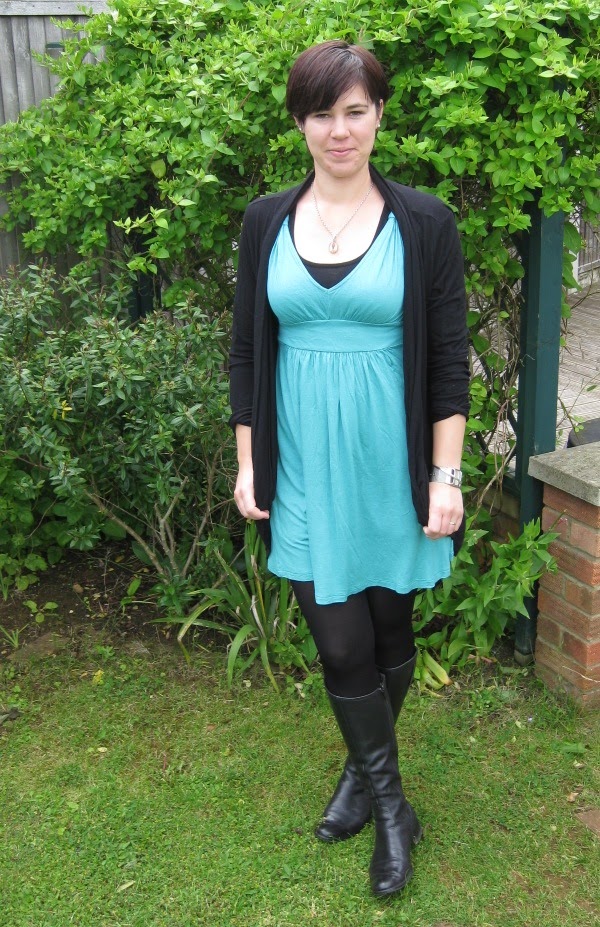 | H&M teal dress, Glassons black cardigan, Shanton long black singlet, H&M tights. |