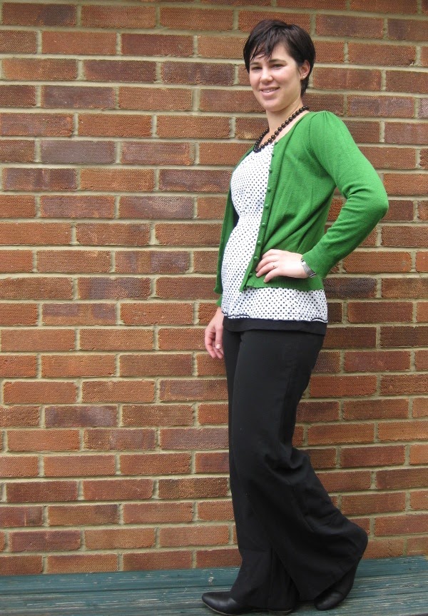| ASOS Chelsea boots, black widelegged pants, Marks and Spencers green cardigan, polka dot singlet, black beads. |