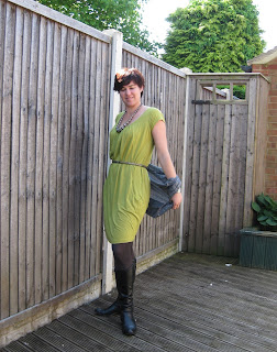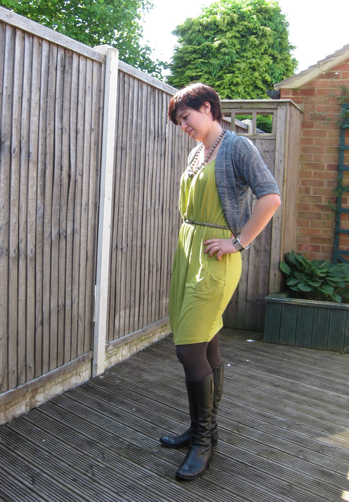 | Esprit Lime Green Dress, Jay Jays Shrug, Beads Thrifted, Grey Tights, Riding Boots. |