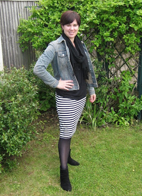 | Tesco suede boots, Primark striped pencil skirt, Black pashmina, Glassons black t-shirt. |