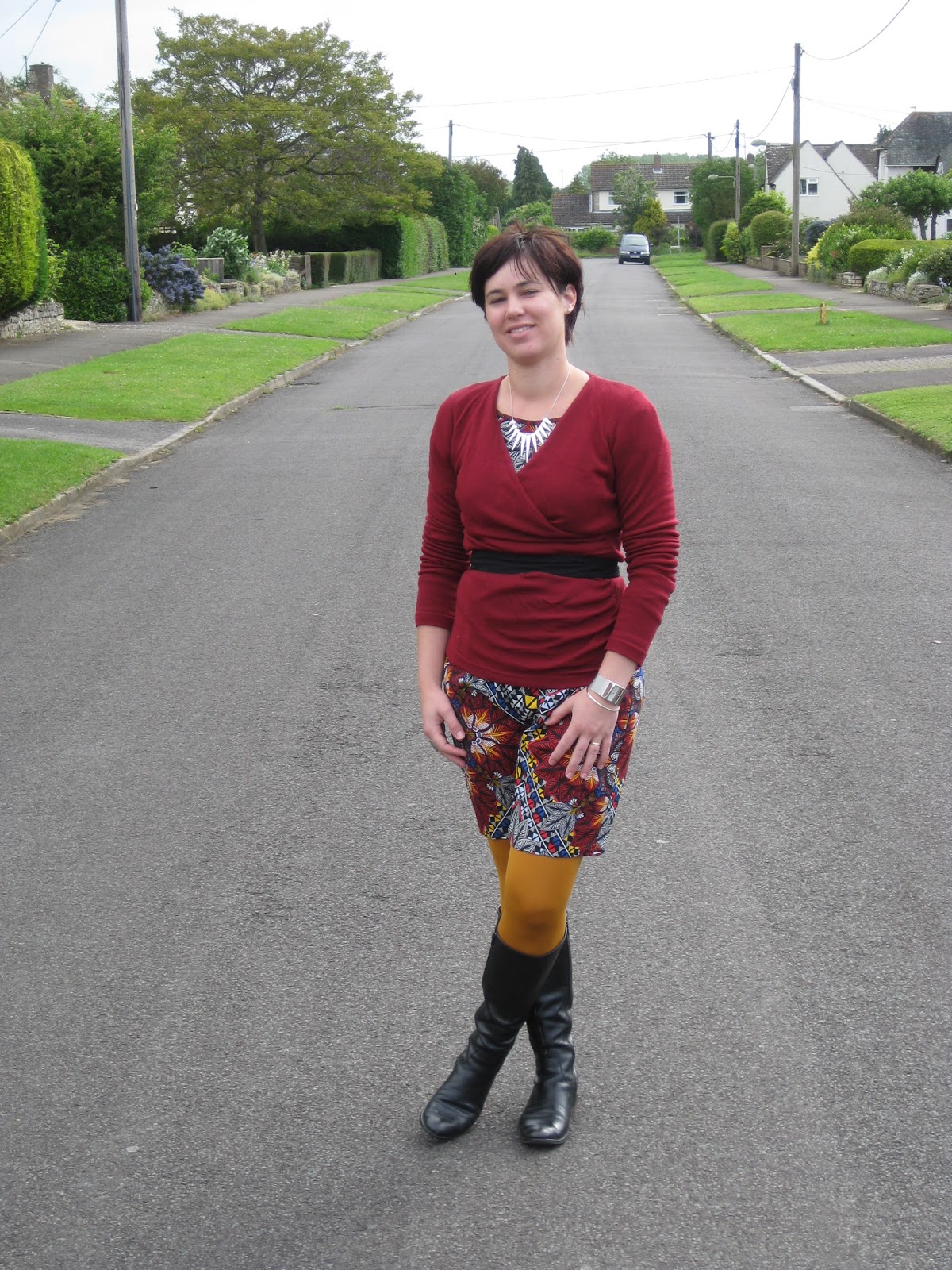 I tried this dress against my mustard, grey and maroon tights this morning and they all go well. I’m sure I won’t be able to help smiling all day in my new clothes. Pity I have to layer with a merino top over and under due to the cool weather!