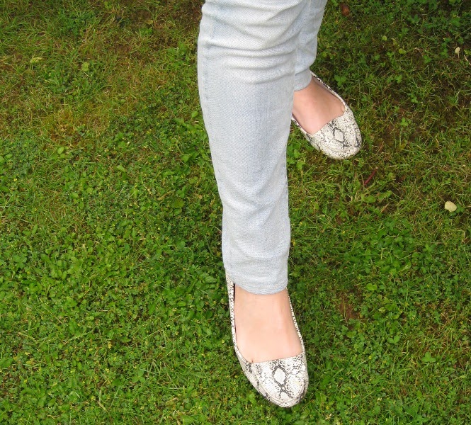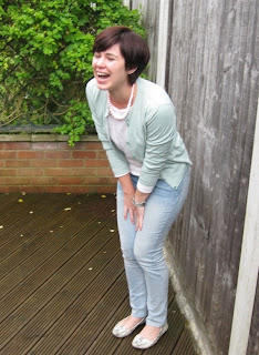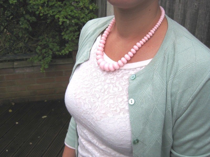 | Pale Levi Jeans, Marks and Spencer Mint Cardigan (thrifted), River Island cream top (thrifted), Beads (thrifted), Primark snakeskin ballet flats. |