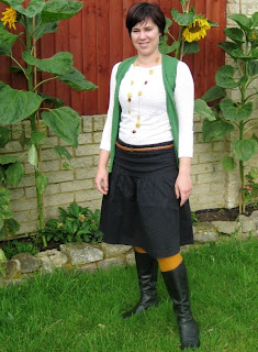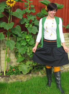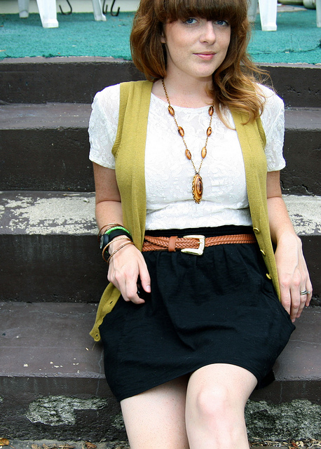 | Ezibuy merino vest, River Island lace top, Thrifted beads, Free belt, Max black skirt, Primark mustard tights. |