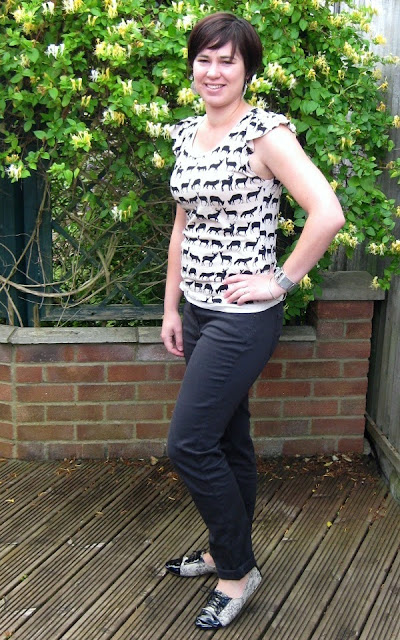 | Warehouse charcoal jeans, Gap singlet, H&M patterned t-shirt, big patterning earrings (unknown). |