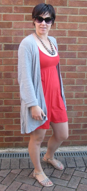 Wearing H&M tangerine sundress (thrifted), Glassons grey cardigan, Next snakeskin print sandals, Portmans singlet and thrifted beads - and trying out cat's eye sunglasses from Tesco's! Linking up with Visible Monday and Thrifters Anonymous today.