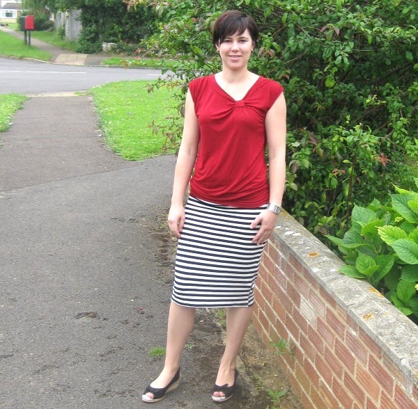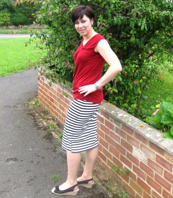 | Red top (gift), Primark striped pencil skirt, Flori slingback wedges. |