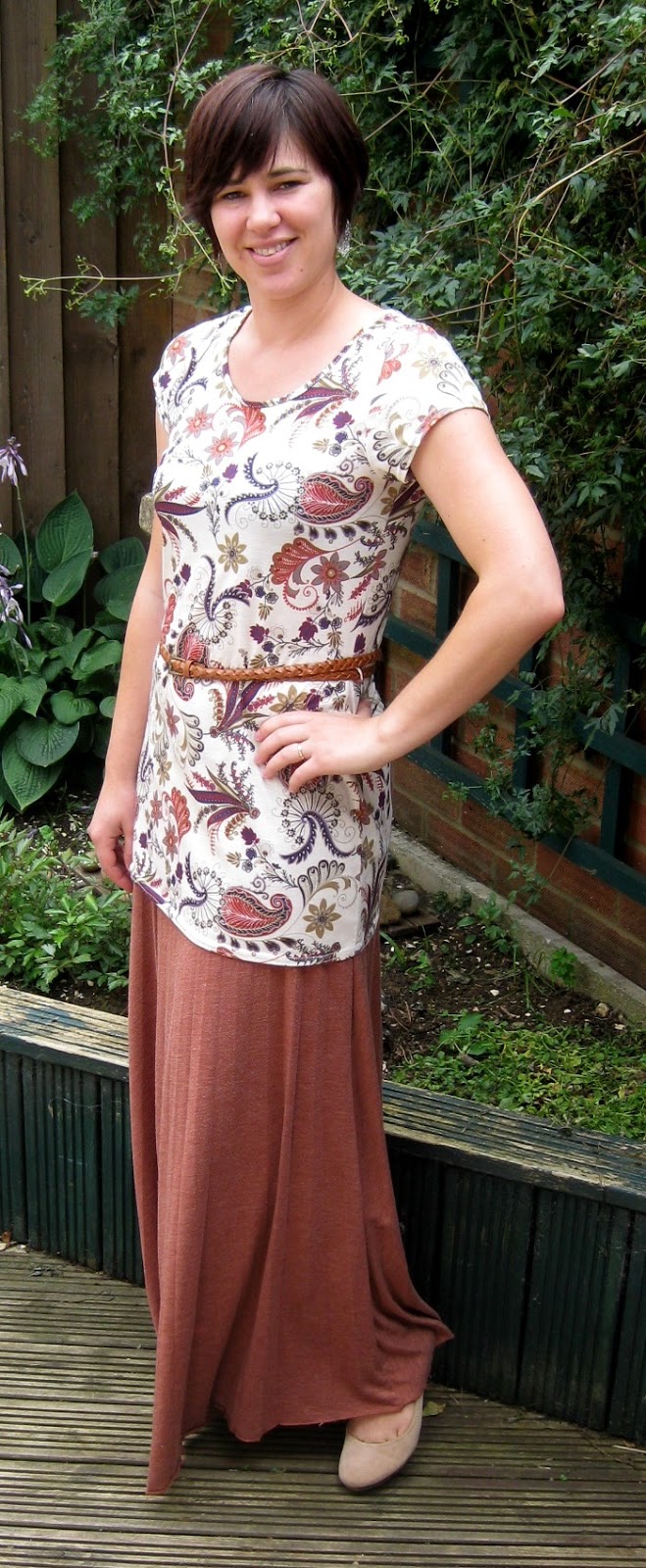 | Peacock paisley long tee and belt, House of Fraser nude wedges. |