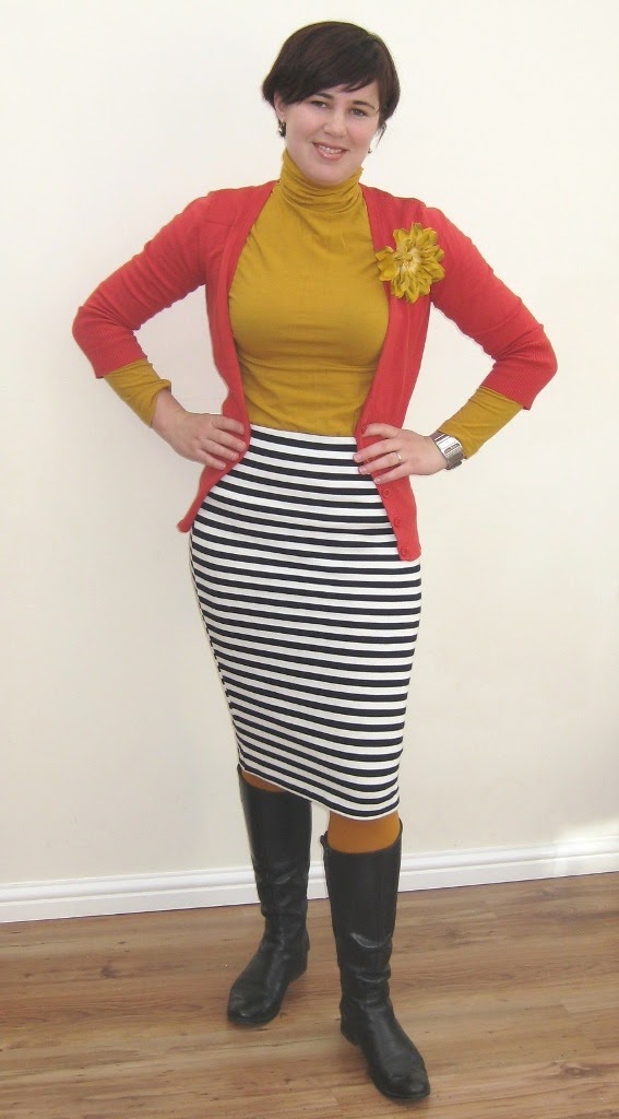 | Primark mustard skivvy, Primark striped pencil skirt, Primark mustard tights, black riding boots, Matalan mustard flower brooch. |