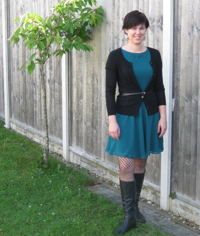 | Gap black cardigan, Tesco black skinny belt, fishnet tights (from the dressup box!). |