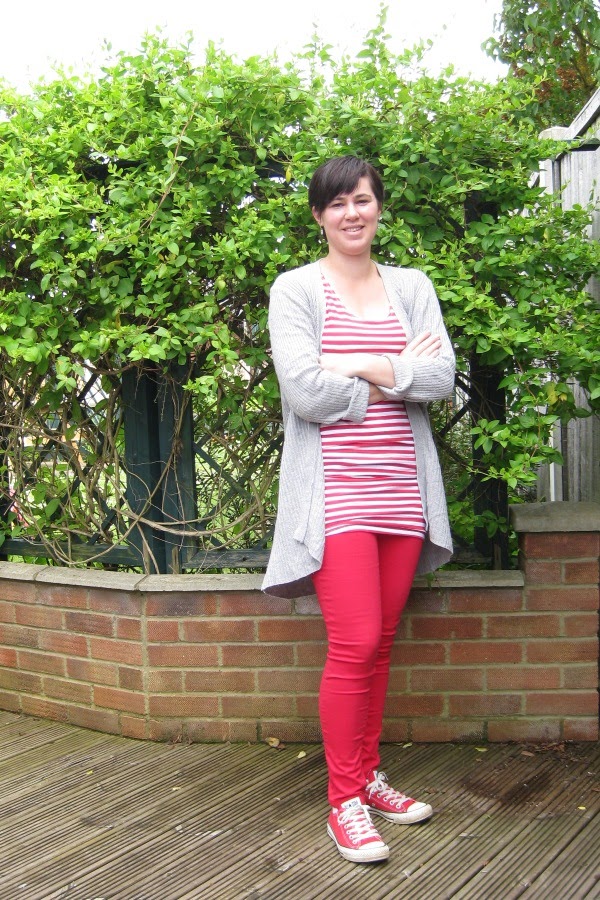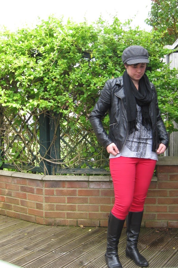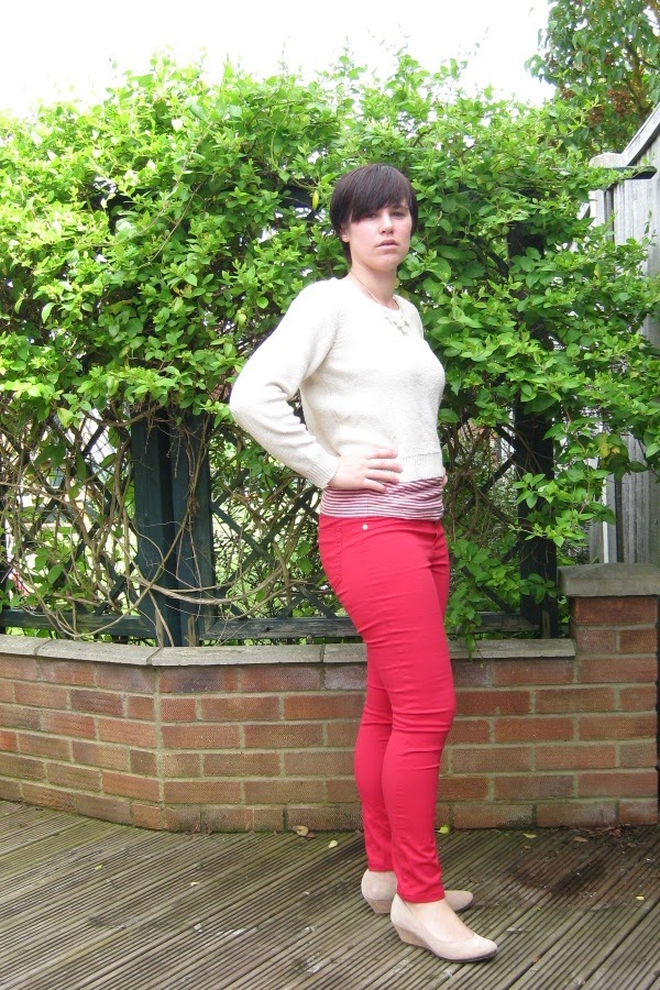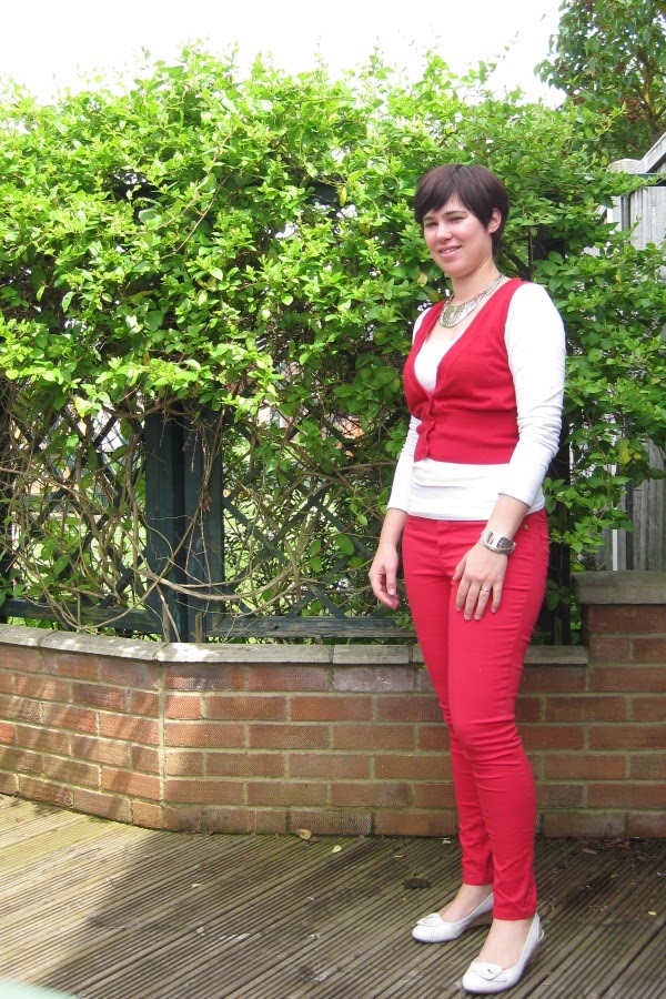 So here goes my first challenge to myself - red Warehouse jeggings (in hindsight I wish I'd bought red jeans instead of jeggings so I could have worn a belt and shown the waistband, but live and learn).