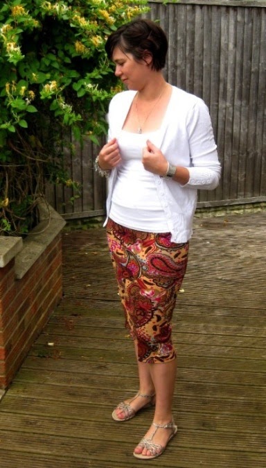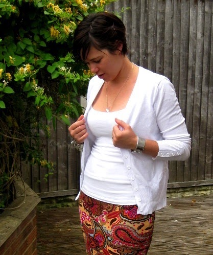 Paisley is an interesting print - I've seen it lately on shoes, scarves, bags and loads of tops. This thrifted skirt is a very old favourite of mine - the print makes it easy to wear with loads of different tops and the soft stretchy jersey fabric took me through two pregnancies and now beyond.