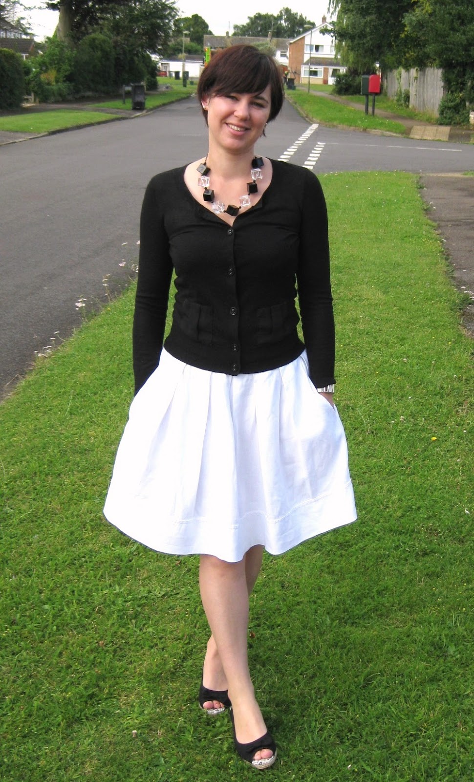 | Warehouse white full skirt, Gap black cardigan, Sports Direct black wedges, Glassons black boob tube, thrifted beads. |