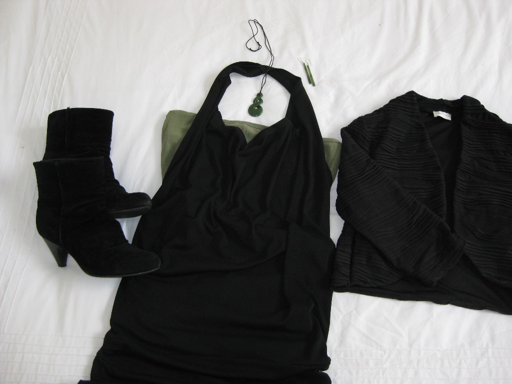 Today's outfit post is a little different - I wore this outfit to try and be in theme - NZ's national costume. The best I could do was to steer towards the All Blacks with my greenstone pendant (gifted) and my favourite black jersey halterneck, asymmetric hem dress (bought as a sample from a manufacters sale for $5).