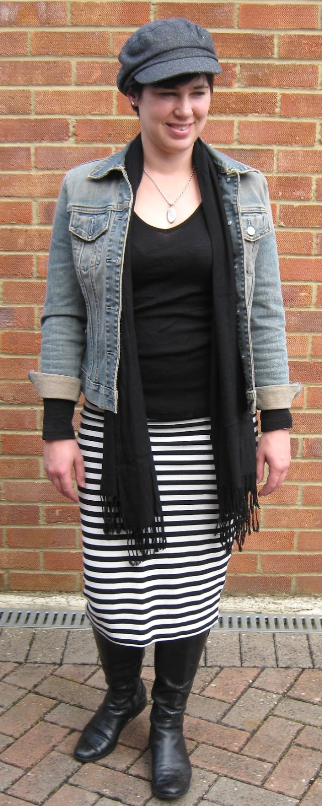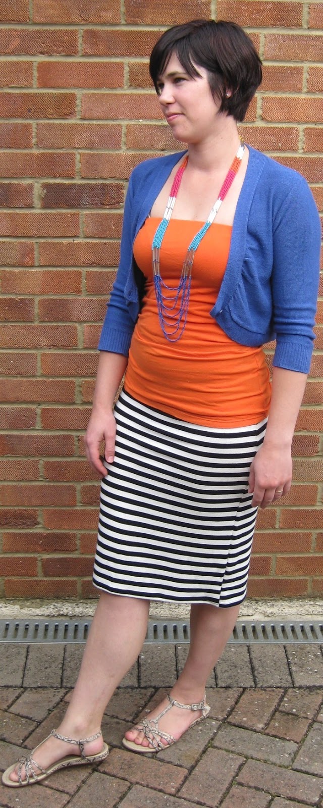I bought this striped pencil skirt from Primark for five pounds and I love it. The stretchy jersey knit is really comfortable (as you might know, I place very high importance on this), and I find the shape and stripes flattering. I do struggle with the length (trying not to make myself look shorter than I am) but discovered in this week's Take 5 challenge that I can comfortably wear it higher on my waist when I'm not in heels.
