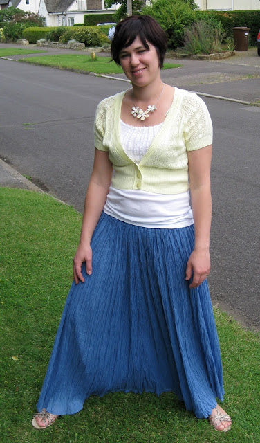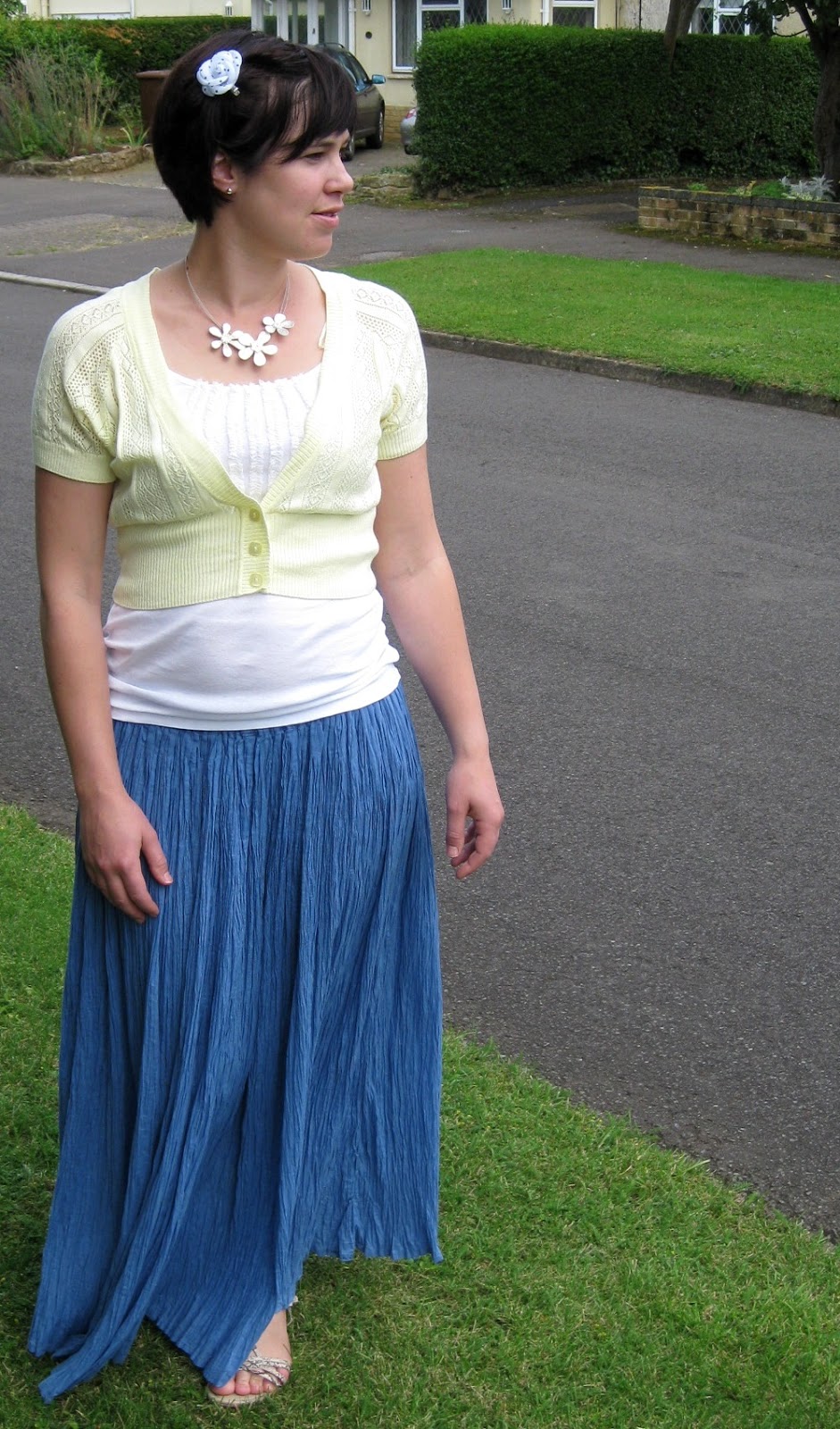 | Miss Selfridge lemon cardigan | Gap white singlet | House of Fraser Pleated maxi skirt | Next sandals | NZ designer flower necklace |
