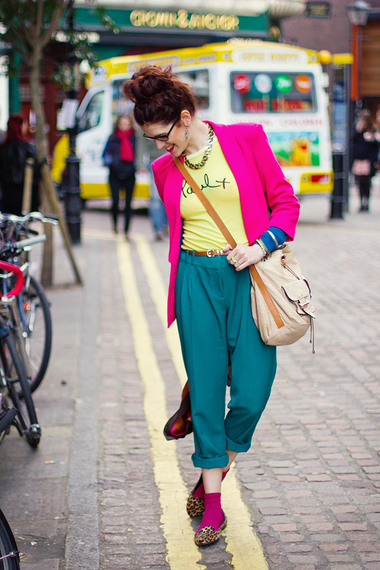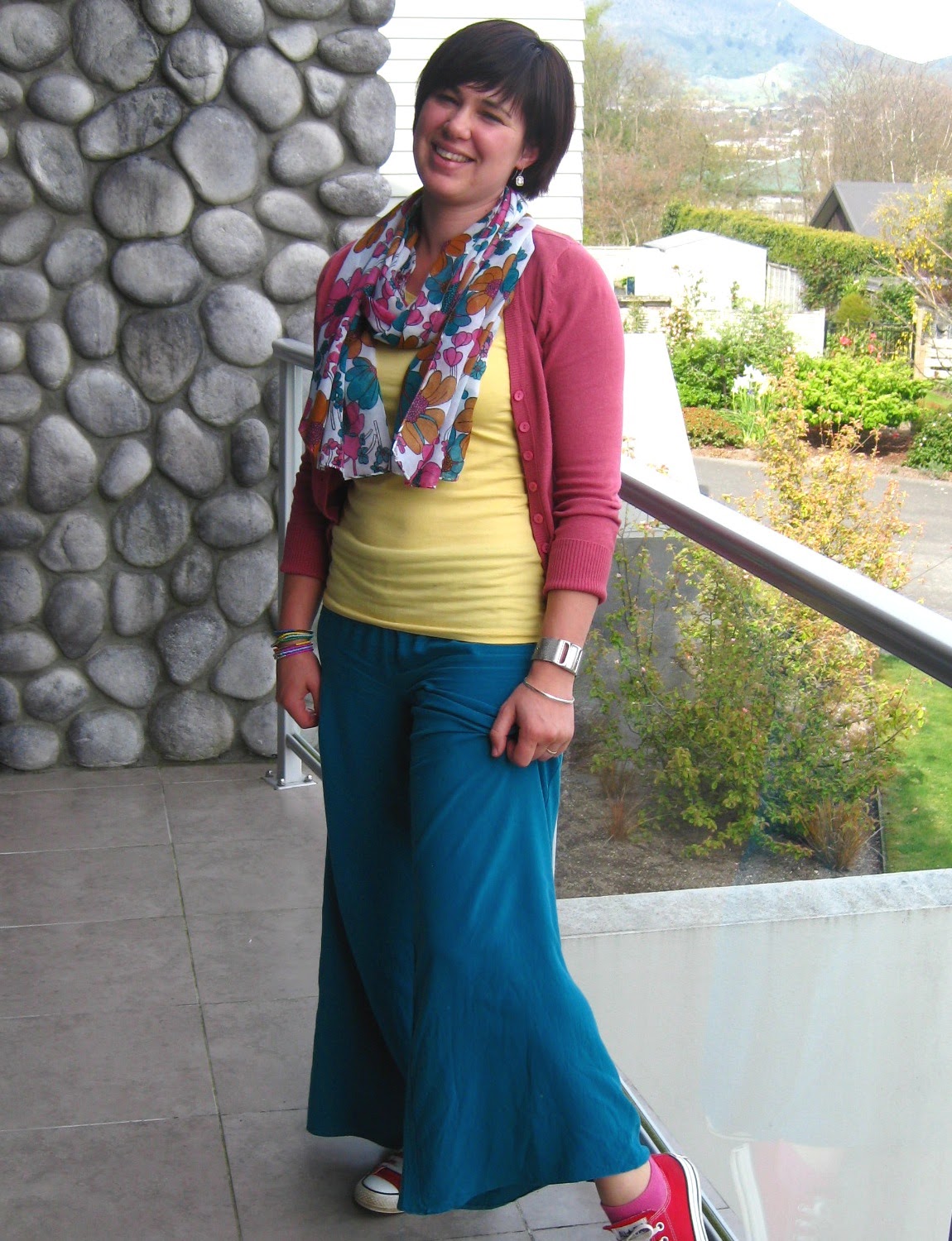 Just home from a fantastic family weekend away. Here's the outfit I wore on day 1 for travelling - I can't believe how much wear I've had from these 4 pound teal palazzo pants. My husband laughed at this outfit but the bold colours in the inspiration pic below were just too fun to go past!