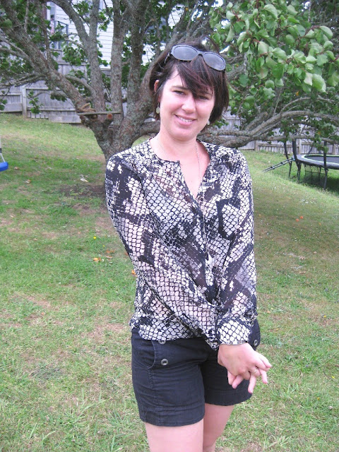 Outfit Two: black shorts (thrifted), Warehouse snakeprint blouse, ASOS gladiator sandals.