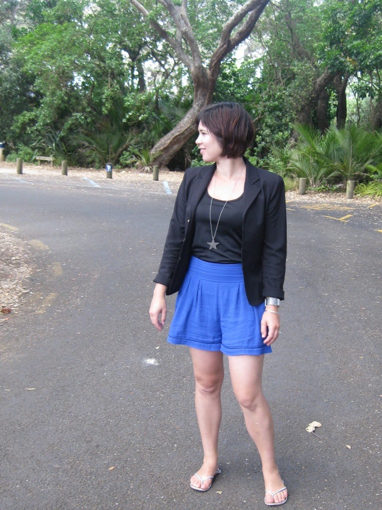 Outfit One: Kmart cobalt blue shorts, Stax black blazer, Jacqui E black tank (all thrifted), Dotti necklace, Cotton On silver sandals.