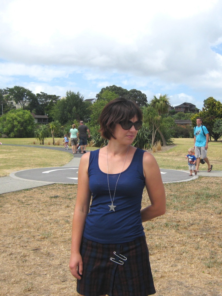 What I wore: thrifted plaid skirt, thrifted navy tank, No 1 Shoe Warehouse tan flats, Dotti star pendant.